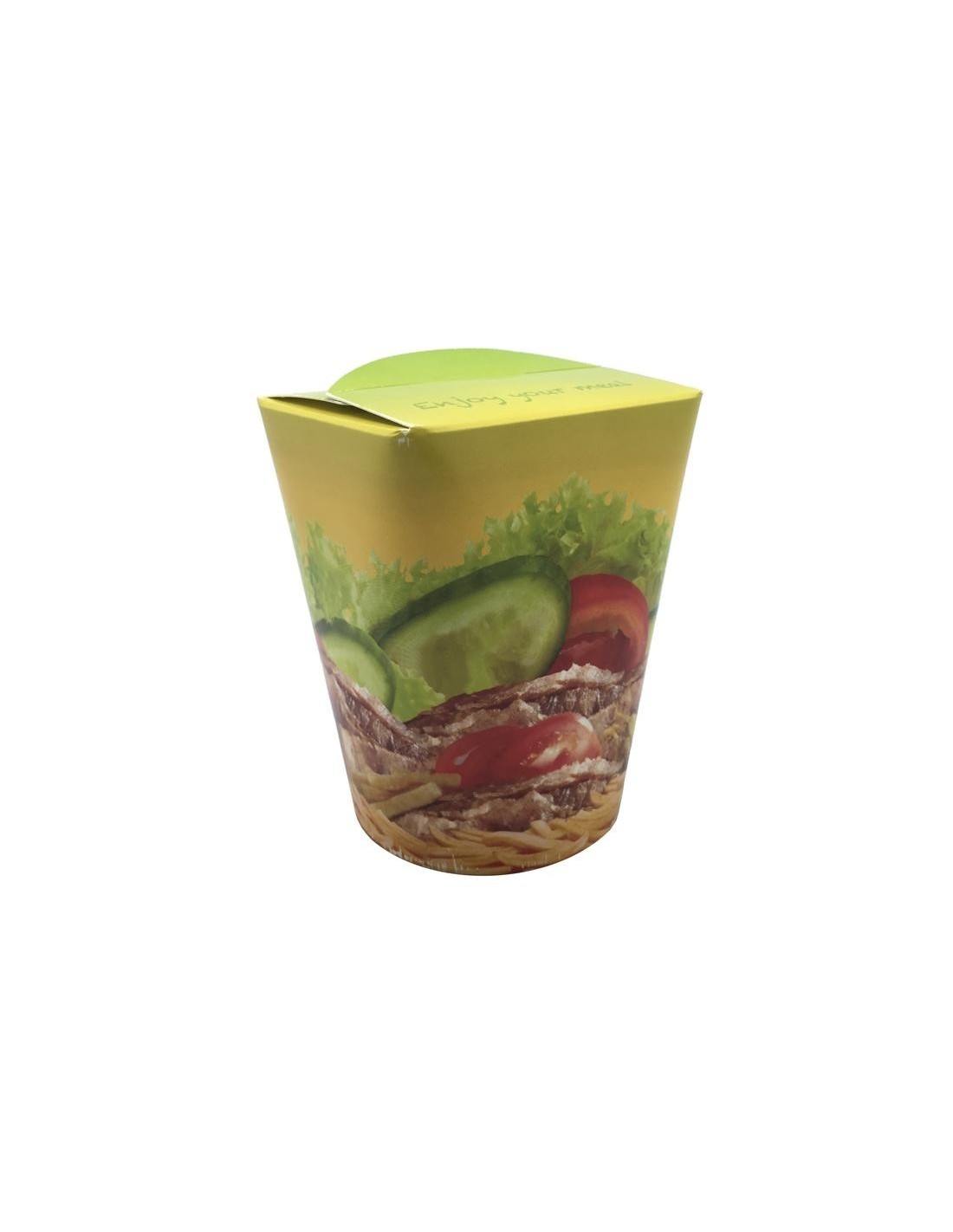 La tapa está incluida. La parte superior se dobla cerrando el envase, pero permitiendo la salida de vapores, de forma de productos fritos no se reblandecen. Es una elección de envasado inteligente para restaurantes Asiáticos, Kebab, Italianos, Delicatessen, Ensaladas para llevar, Caterings, etc.