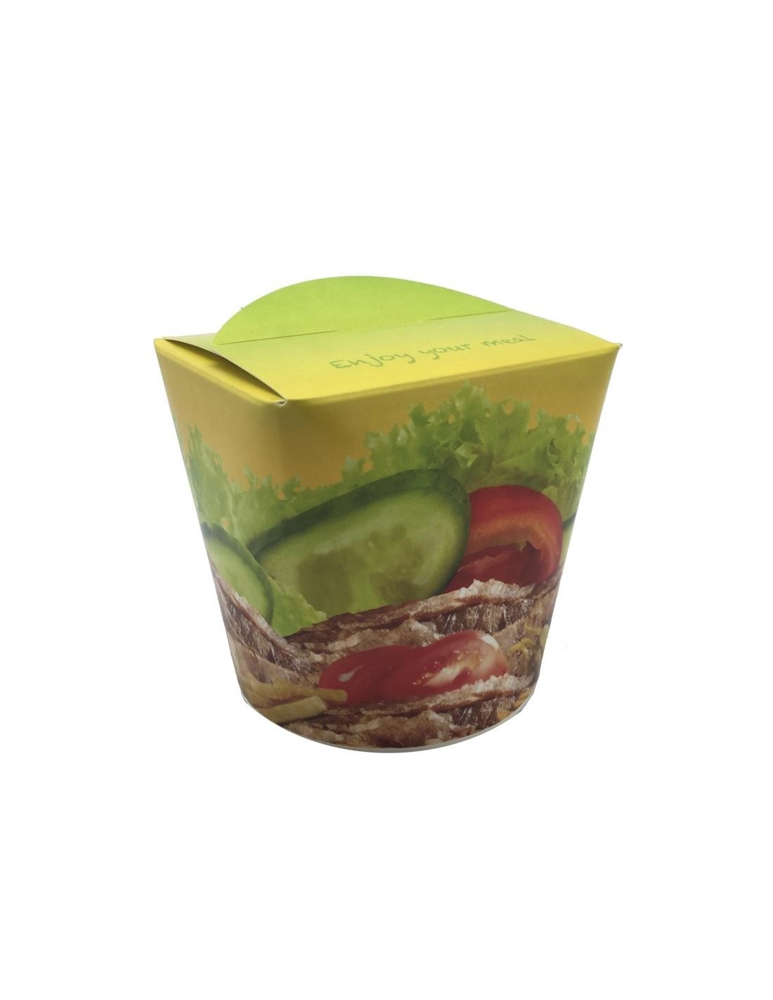 La tapa está incluida. La parte superior se dobla cerrando el envase, pero permitiendo la salida de vapores, de forma de productos fritos no se reblandecen. Es una elección de envasado inteligente para restaurantes Asiáticos, Kebab, Italianos, Delicatessen, Ensaladas para llevar, Caterings, etc.